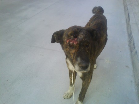 Tenemos constancia de un perro abandonado cruce de mastín, al que algún desalmado le había abierto la cabeza e intentado ahorcar.